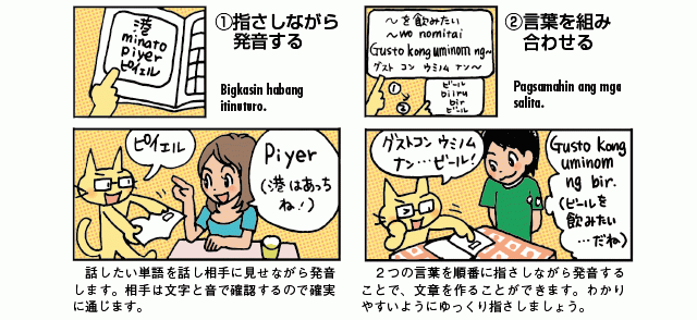 2つの言葉を順番に指さしながら発音することで、文章をつくることができます。